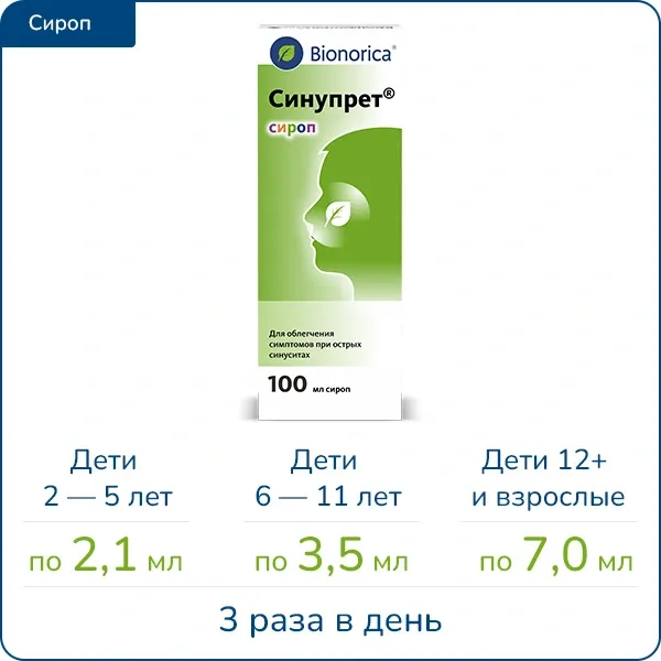 Возраст Дозировка Дети от 6 до 11 лет (Синупрет) По 1 таблетке 3 раза в день Подростки старше 12 лет и взрослые По 2 таблетке 3 раза в день (Синупрет®) По 1 таблетке 3 раза в день (Синупрет® Экстракт и Синупрет® Форте)