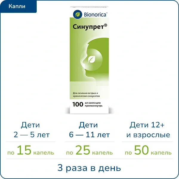 * Синупрет® (капли) – для взрослых и детей с 2-х лет; Синупрет® (таблетки) – для взрослых и детей старше 6 лет.